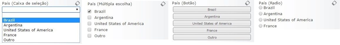 Os campos de seleção podem ser apresentados das seguintes formas: caixas de seleção, múltipla escolha, botões ou radios.