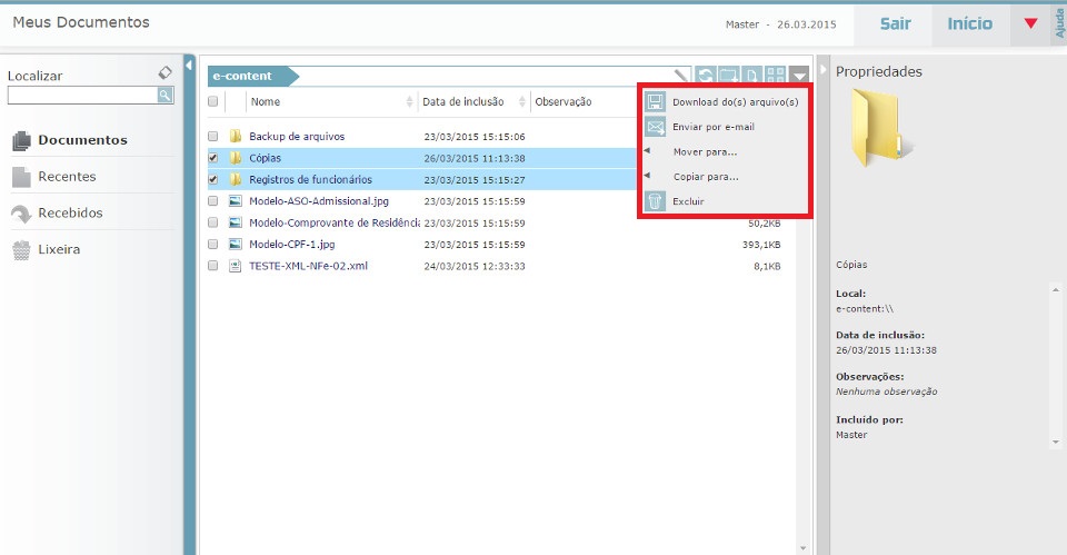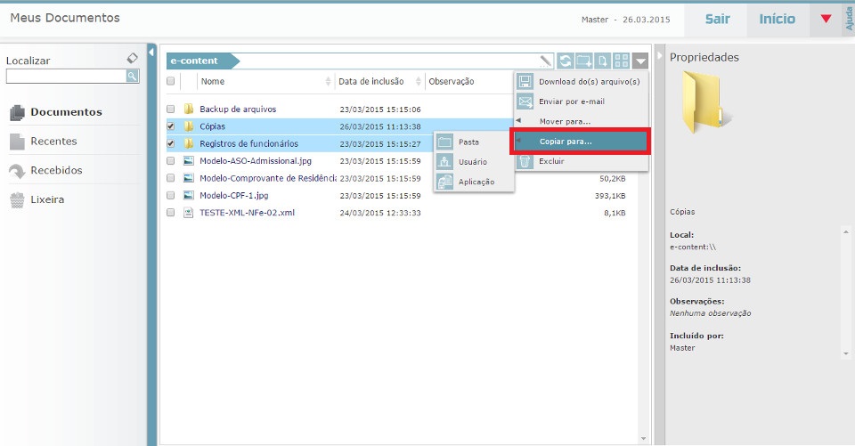 Para copiar uma ou mais pastas de um local para outro, existem dois procedimentos que podem ser executados: enviar para outra pasta ou enviar para outro usuário.